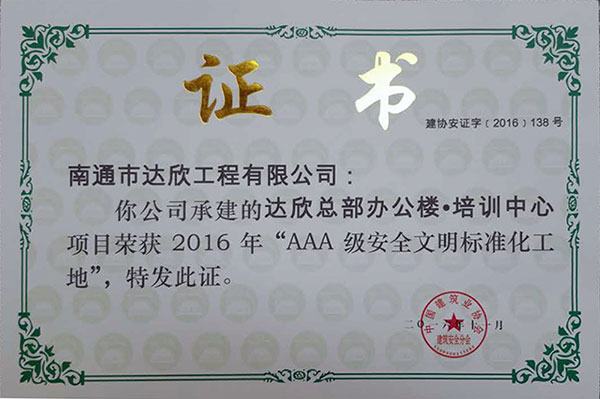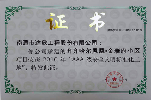 近幾年我公司獲得全國AAA級安全文明標(biāo)準(zhǔn)化工地23項(xiàng),創(chuàng)建面涉及上海、江蘇、河北、黑龍江、湖南、新疆等市場,榮譽(yù)的取得為進(jìn)一步提升達(dá)欣在全國各個(gè)市場的影響力,促進(jìn)企業(yè)健康發(fā)展奠定堅(jiān)實(shí)的品牌基礎(chǔ)。