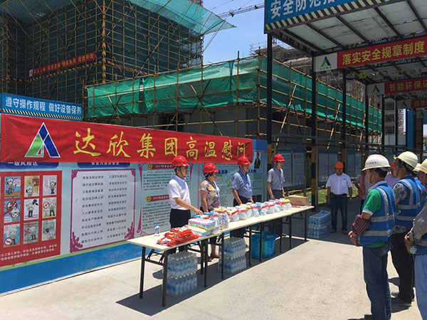 為切實(shí)做好防暑降溫,確保夏季安全生產(chǎn),日前,集團(tuán)公司黨委委員、副總經(jīng)理溫鶴華、常務(wù)副總經(jīng)理王邦國(guó)等領(lǐng)導(dǎo)在第一工程公司經(jīng)理杭小建的陪同下,對(duì)所建的明珠城10號(hào)地塊、旭輝鉑悅犀湖、大豐道誠科技大廈、宿遷星月城等項(xiàng)目進(jìn)行現(xiàn)場(chǎng)檢查與高溫慰問活動(dòng),為堅(jiān)守在施工一線的職工們送來夏季的清涼。