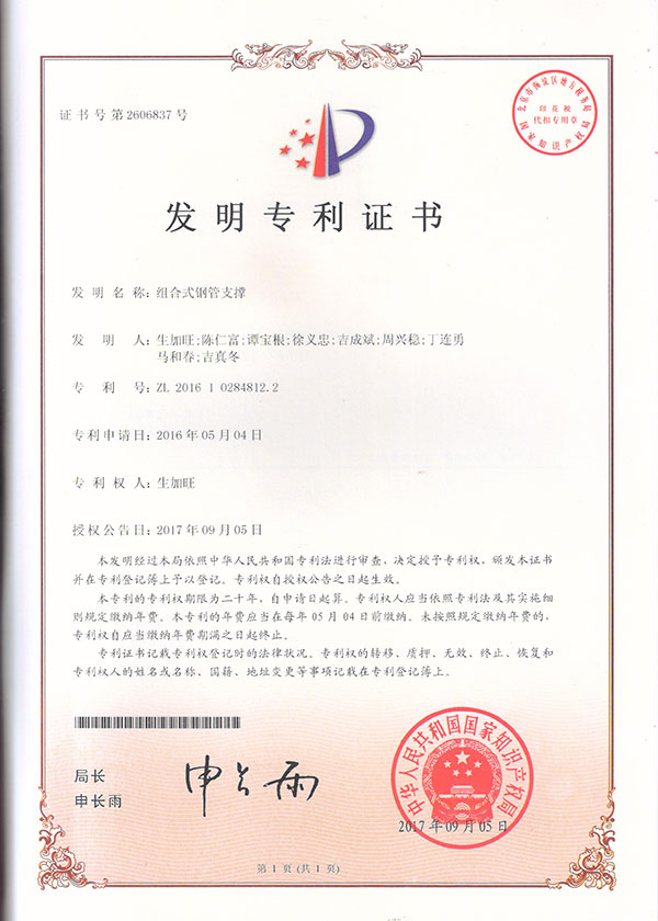 由第三工程公司生加旺、陳仁富、譚寶根等研制申報的“組合式鋼管支撐”專利成果,于2017年9月5日經(jīng)中華人民共和國知識產(chǎn)權(quán)局審核,授予發(fā)明專利證書。