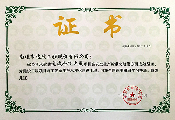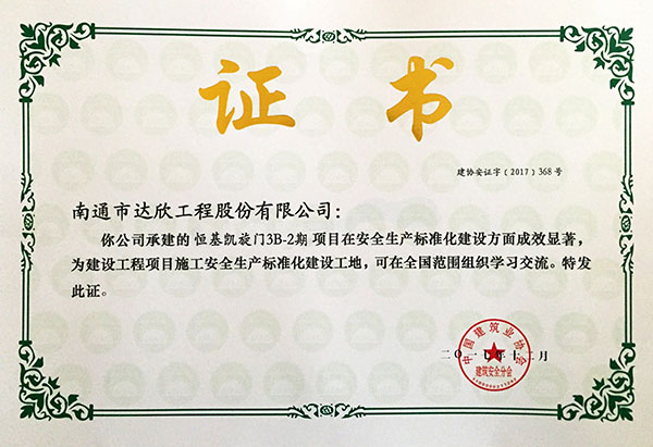 近幾年,我公司獲得全國AAA級安全文明標(biāo)準(zhǔn)化工地25項,創(chuàng)建面涉及上海、江蘇、河北、黑龍江、湖南、新疆等市場,榮譽的取得為進一步提升“達欣”在全國各個市場的影響力,促進企業(yè)健康發(fā)展奠定堅實的品牌基礎(chǔ)。