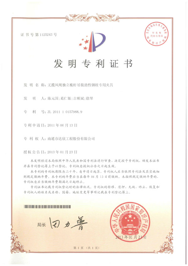 國(guó)家知識(shí)產(chǎn)權(quán)局對(duì)我公司申報(bào)的專利成果“無(wú)攬風(fēng)繩獨(dú)立桅桿吊裝勁性鋼柱專用夾具”,授予了發(fā)明型專利證書,這是我公司首次獲得此類型專利,標(biāo)志著公司專利成果的水平躍上新的臺(tái)階。