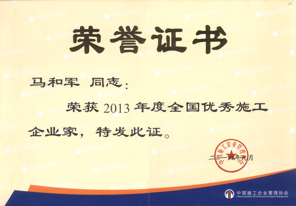 公司董事長(zhǎng)馬和軍榮獲全國(guó)優(yōu)秀施工企業(yè)家