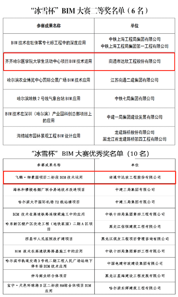 近日,由黑龍江建筑協(xié)會主辦的第一屆“冰雪杯”建設(shè)工程BIM大賽決賽評比結(jié)果公示,第七工程公司兩項(xiàng)目分獲二等獎和優(yōu)秀獎。