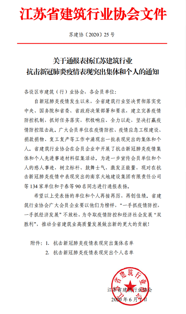 日前,公司獲得江蘇省建筑行業(yè)抗擊新冠肺炎疫情表現(xiàn)突出集體,黨委書(shū)記劉厚純獲得江蘇省建筑行業(yè)抗擊新冠疫情表現(xiàn)突出個(gè)人。