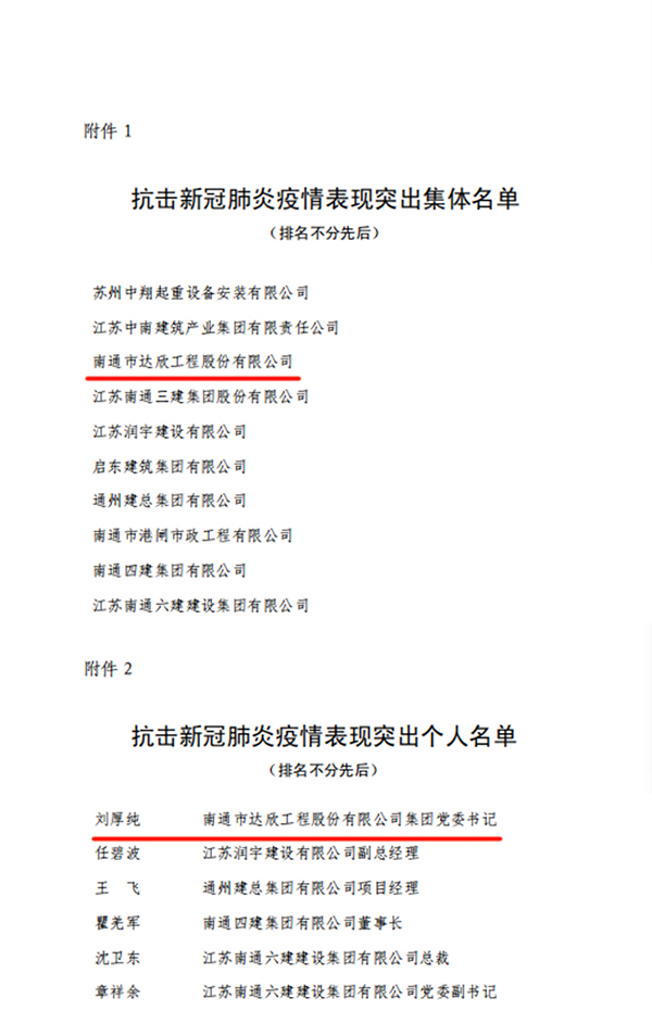 達(dá)欣集團(tuán)榮獲江蘇建筑行業(yè)抗擊疫情表現(xiàn)突出集體和個(gè)人