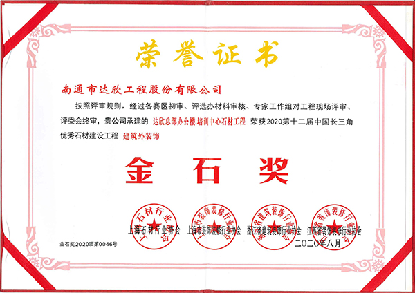 中國長三角石材建設(shè)工程“金石獎(jiǎng)”是石材工程領(lǐng)域的奧斯卡金獎(jiǎng),達(dá)欣總部辦公樓培訓(xùn)中心獲此殊榮是對該項(xiàng)目完美品質(zhì)和公司實(shí)力的充分肯定。我們將以此為動(dòng)力,繼續(xù)打造更多精品工程,為達(dá)欣的發(fā)展增光添彩。