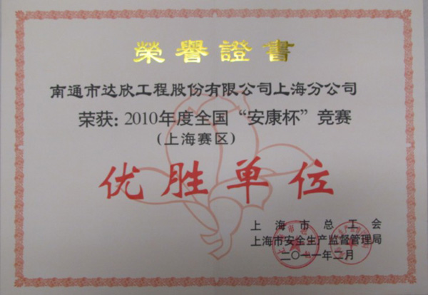 會上還對“安康杯”競賽活動的先進(jìn)集體與個(gè)人進(jìn)行了表彰。第一工程公司“安康杯”競賽活動工作的有效開展,得到了上海市總工會、上海市安全生產(chǎn)監(jiān)督管理局、上海市建交委、江蘇省駐滬辦的充分肯定,為此被評為2010年全國“安康杯”競賽(上海賽區(qū))優(yōu)勝單位(受此表彰的外省市進(jìn)滬施工企業(yè)僅此三家),這也是第一工程公司連續(xù)三年獲此榮譽(yù)。