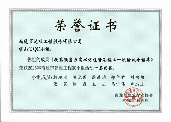 2月24日,南通市建筑行業(yè)協(xié)會發(fā)布2025年南通市工程建設(shè)質(zhì)量管理小組(QC 小組)活動評價(jià)結(jié)果,公司寶山區(qū)大場鎮(zhèn) W12-1301 單元 32-04 地塊項(xiàng)目寶山匯 QC 小組選送的《提高預(yù)應(yīng)力實(shí)心方樁靜壓施工一次驗(yàn)收合格率》成果,榮獲一類成果。