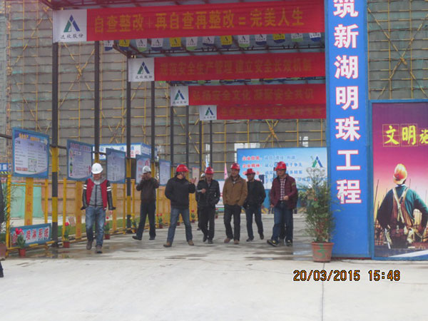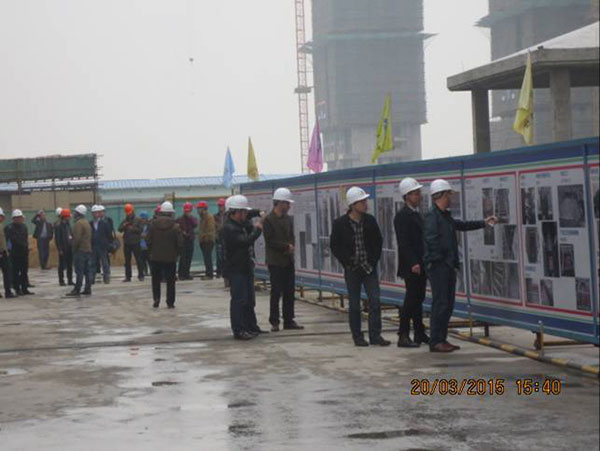 施工現(xiàn)場(chǎng),項(xiàng)目經(jīng)理崔益明就工程概況、文明工地創(chuàng)建采取的措施、質(zhì)量管理方面新工藝、新材料革新以及采用樣板引路所取得的成效向來(lái)訪嘉賓作了詳細(xì)介紹??疾旒钨e們一行先后參觀了11#、12#地塊現(xiàn)場(chǎng)文明施工、樣板展示區(qū)、結(jié)構(gòu)實(shí)體工程,對(duì)該項(xiàng)目部施工生產(chǎn)、安全質(zhì)量、現(xiàn)場(chǎng)文明等方面給予了高度評(píng)價(jià)。蘇州新湖置業(yè)王總表示希望在蘇州區(qū)域保持良好持久合作的基礎(chǔ)上,將積極推薦我司參與新湖中寶其他區(qū)域公司的項(xiàng)目合作。