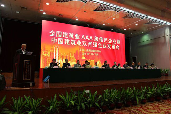 2016年1月7日,為展示全國(guó)建筑業(yè)AAA級(jí)信用企業(yè)和中國(guó)建筑業(yè)雙百?gòu)?qiáng)企業(yè)品牌形象,弘揚(yáng)誠(chéng)信經(jīng)營(yíng)、追求卓越的行業(yè)風(fēng)氣,中國(guó)建筑業(yè)協(xié)會(huì)在珠海召開(kāi)2015年度全國(guó)建筑業(yè)AAA級(jí)信用企業(yè)暨2014年度中國(guó)建筑業(yè)雙百?gòu)?qiáng)企業(yè)發(fā)布會(huì)。中國(guó)建筑業(yè)協(xié)會(huì)會(huì)長(zhǎng)王鐵宏、副會(huì)長(zhǎng)兼秘書(shū)長(zhǎng)吳濤出席會(huì)議,副秘書(shū)長(zhǎng)李蓬主持會(huì)議。廣東省住房城鄉(xiāng)建設(shè)廳黨組副書(shū)記、巡視員陳英松致歡迎辭,各地區(qū)和有關(guān)行業(yè)建設(shè)協(xié)會(huì)和企業(yè)代表等共400余人參會(huì)。